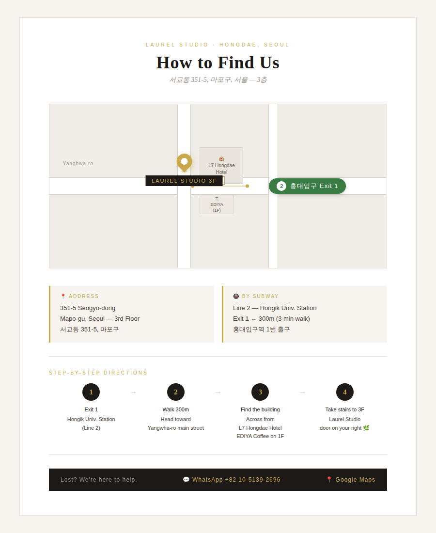 We're located in the heart of Hongdae, Seoul — one of Korea's most vibrant neighborhoods for art, music, and culture.
